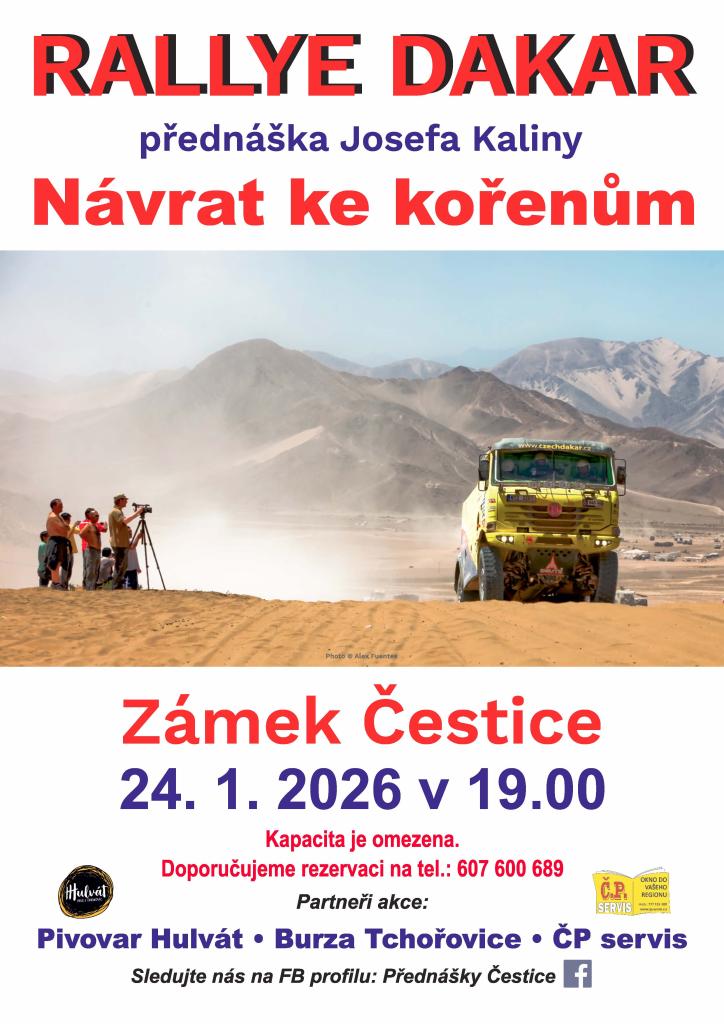 Zveme vás na přednášku Josefa Kaliny, která se zaměří na Rallye Dakar. Téma přednášky je 'Návrat ke kořenům'. Akce se uskuteční 24. ledna 2026 v 19:00 hodin v Zámku k Čestice. Kapacita míst je omezena, proto doporučujeme rezervaci na telefonním čísle 607 600 689. Těšíme se na vaši účast.